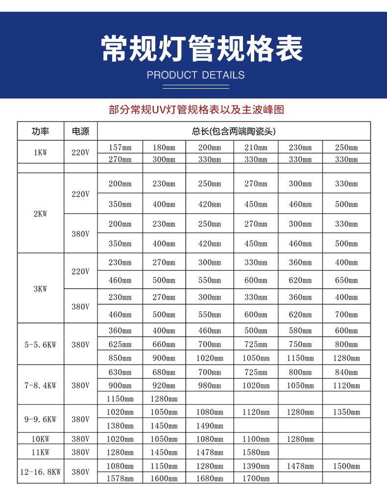 這款UV燈管專為各行業打造。主波峰310nm-410nm、功率400W-18kw、長度120mm-1179mm、管徑Φ22.5mm-Φ25mm皆可定制。220V-380V供電,純鎢電極,800-1000h質保。能滿足
