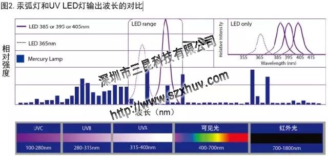 UV燈管的輸出量進行重疊。利用特定的系統化設計有可能達到很高的效率,這種設計利用光引發劑在UV-A范圍的集中吸收來進行UV LED固化。
